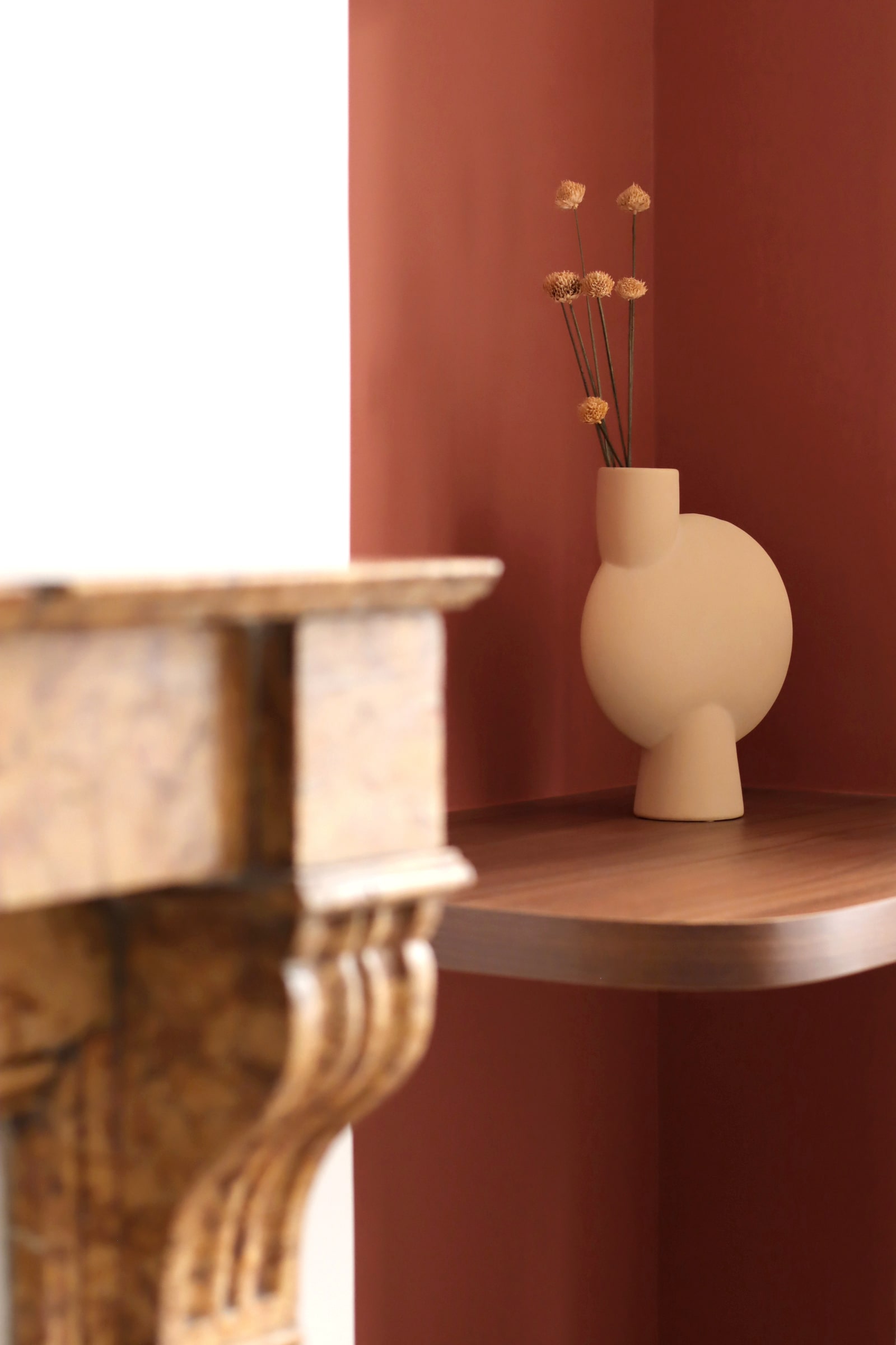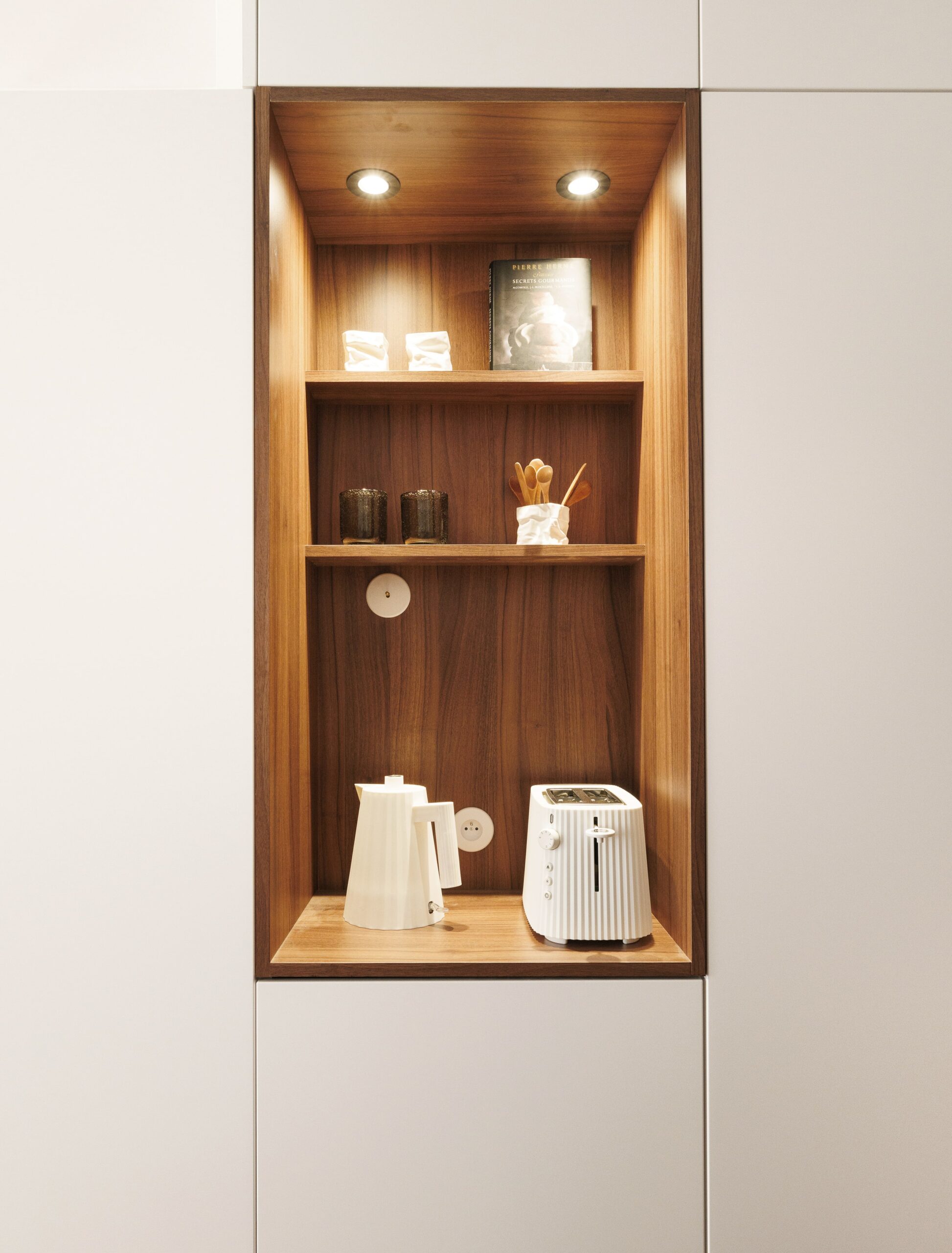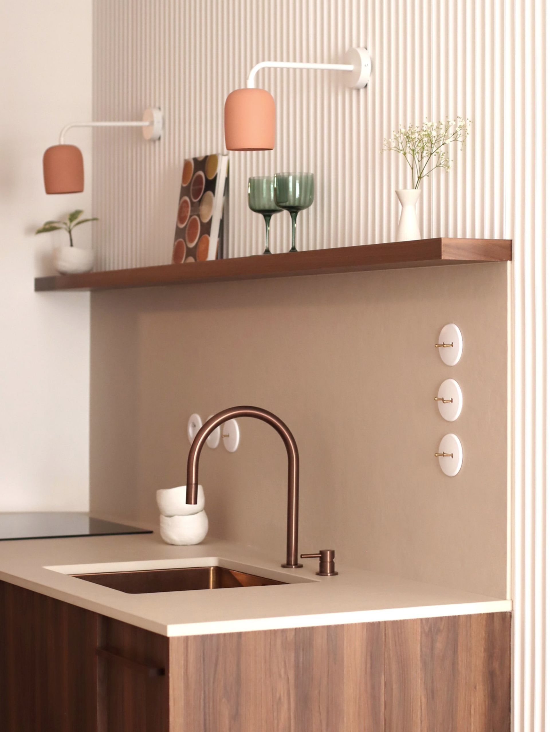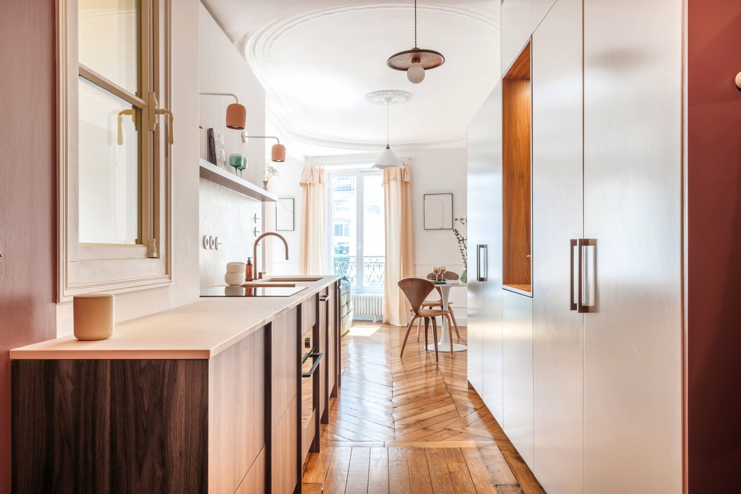 Totalement optimisé grâce aux agencements 100% sur mesure, l’espace est sublimé par le choix des matériaux. Le parquet en point de Hongrie a retrouvé son éclat, tout comme les moulures, et s’accompagne de matières texturées et matériaux bruts invitant au toucher : brique contemporaine, carrelage effet papier froissé, luminaires en papier, plan de travail en céramique veloutée, placages en noyer, robinetterie aux reflets cuivrés…