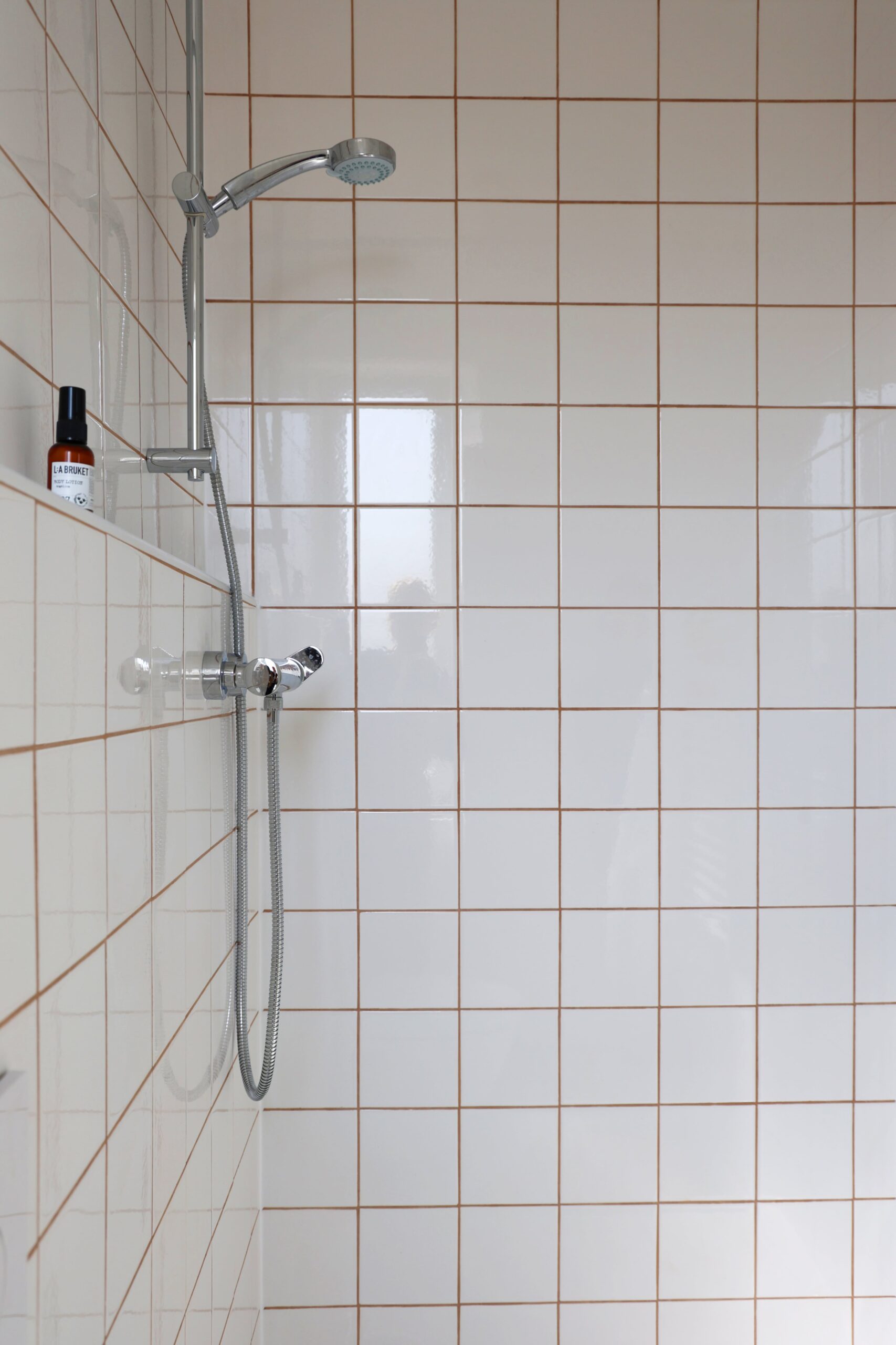 Le choix des matériaux bruts – MDF verni, inox, bois d’origine – apporte du caractère tout en restant économique. Dans la cuisine et la salle de bain, le retour aux carreaux blancs classiques est dynamisé par des joints couleur bois ou gris, qui modernisent l’ensemble.