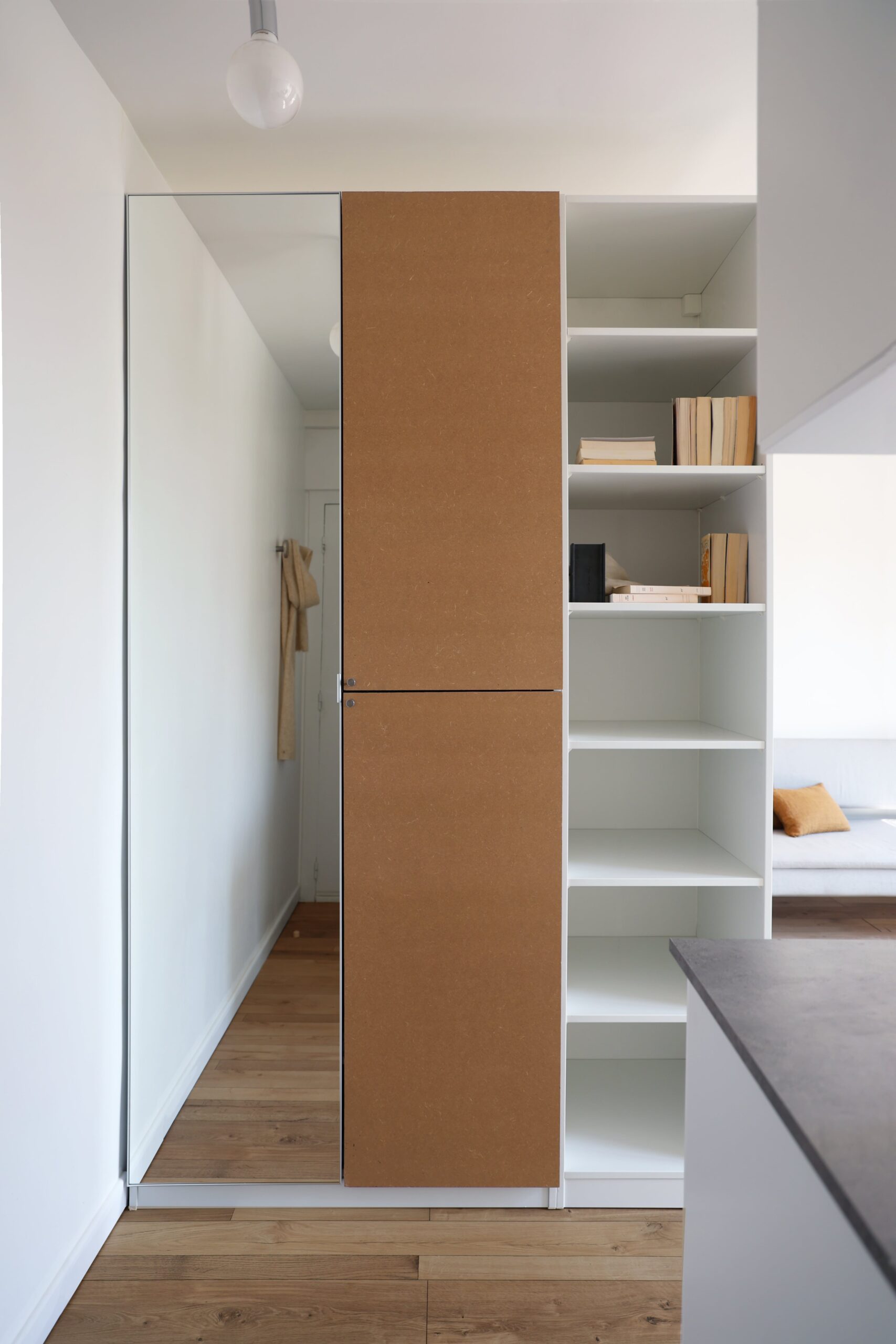 Nous avons commencé par décloisonner et repenser entièrement le plan de l’appartement afin de maximiser chaque mètre carré et d’offrir une véritable sensation d’espace. L’agencement a été entièrement redessiné grâce à des solutions sur mesure qui permettent de délimiter les fonctions sans cloisonner. Désormais, ce petit appartement optimisé dispose d’une entrée avec rangements intégrés, d’une pièce à vivre lumineuse avec cuisine ouverte, d’un espace salon convivial, d’un coin bureau fonctionnel, d’un dressing bien pensé ainsi que d’un coin nuit délicatement dissimulé. La salle d’eau rénovée gagne en luminosité et en confort, avec une optimisation maximale de chaque détail.