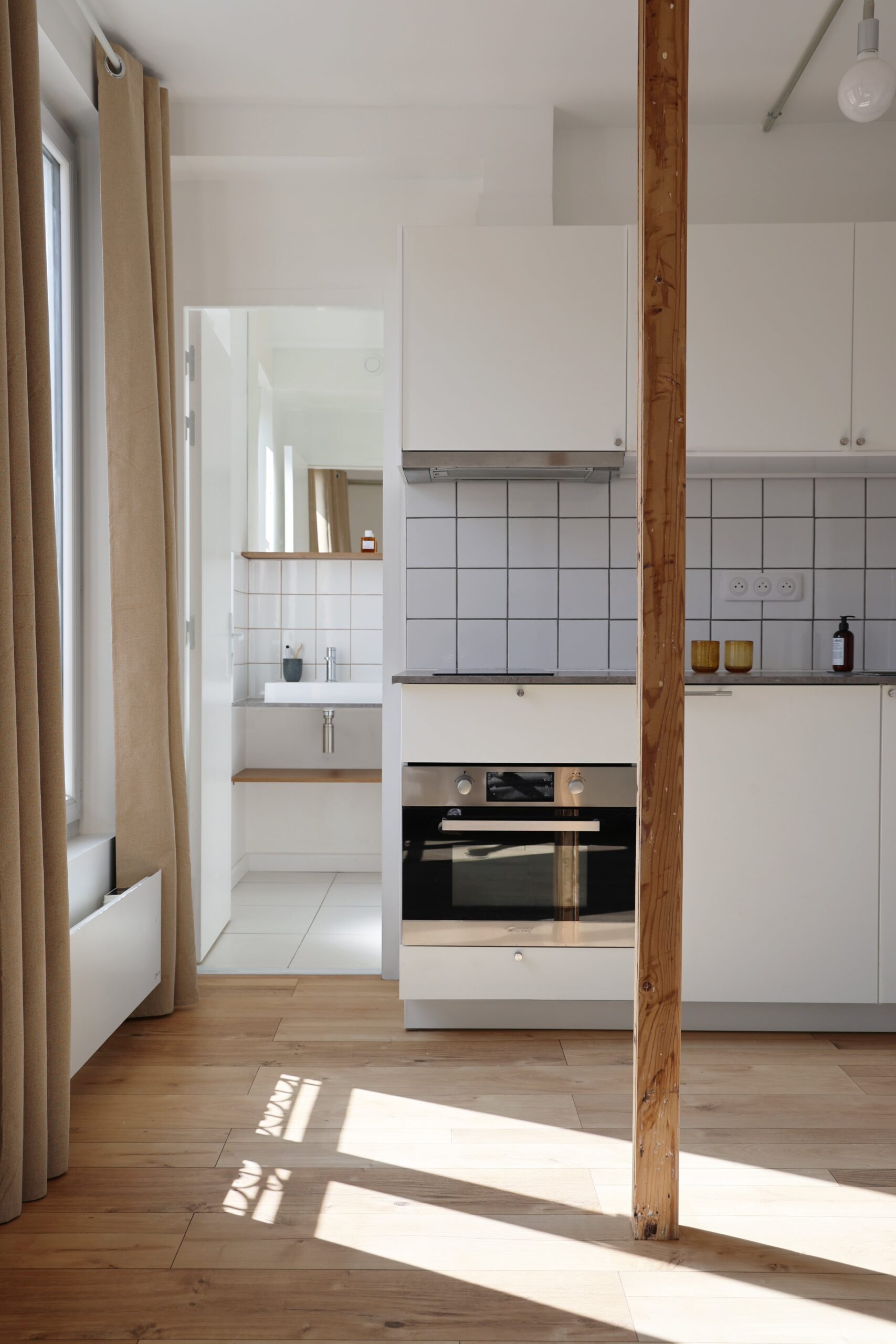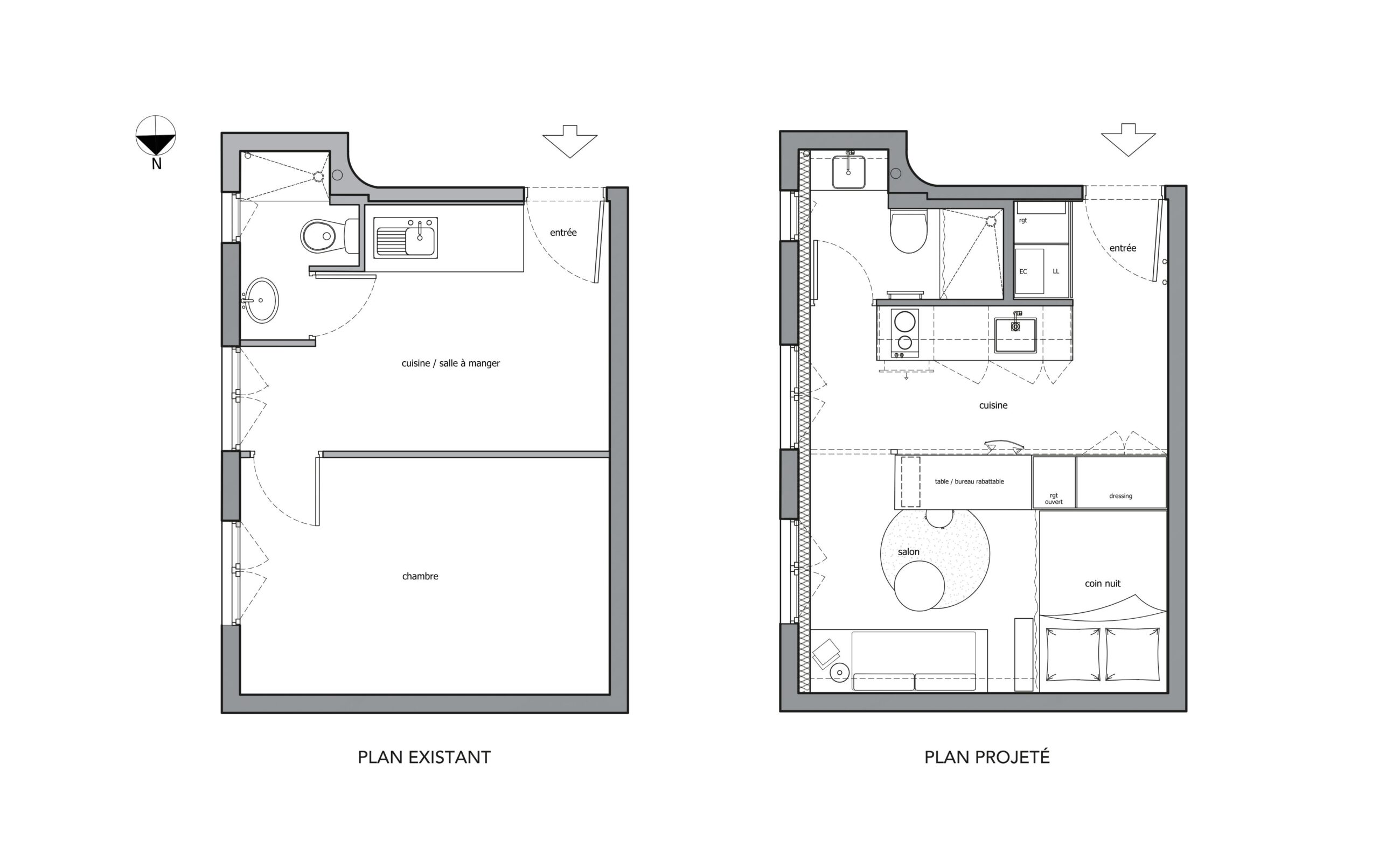 Ce deux-pièces de 22m², mal proportionné, souffrait d’un agencement peu fonctionnel : une cuisine occupant presque la moitié de la surface et une seconde pièce utilisée à la fois comme salon et chambre. Résultat : un appartement peu pratique, sans espace “salon” et peu agréable à vivre au quotidien.
